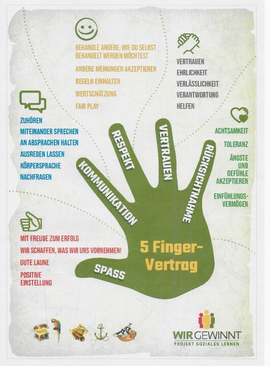 Innerhalb der Projektwoche 2019 “Wir gewinnt“ wurde mit den Kindern und dem Kollegium gemeinsam der sogenannte Fünf-Finger-Vertrag zur Stärkung der Sozialkompetenz entwickelt. Seitdem ist dieser Vertrag fest in unserem Schulalltag verankert. Dieser regelt das Verhalten untereinander und wird durch gegenseitiges Abklatschen „unterzeichnet“.